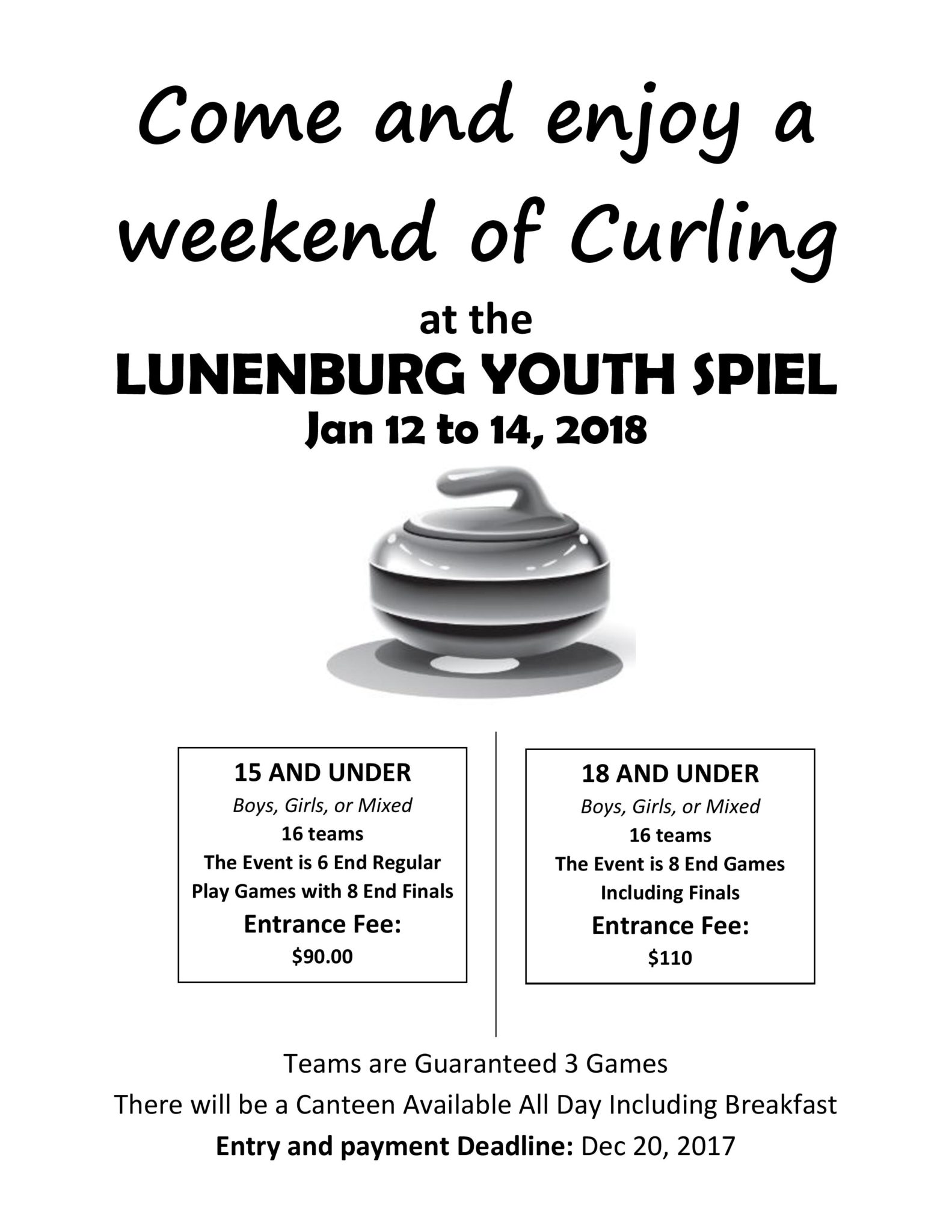 U18 Division: 16 Teams (Boys, Girls or Mixed). The Event is 8 End Games including Finals. $110/team