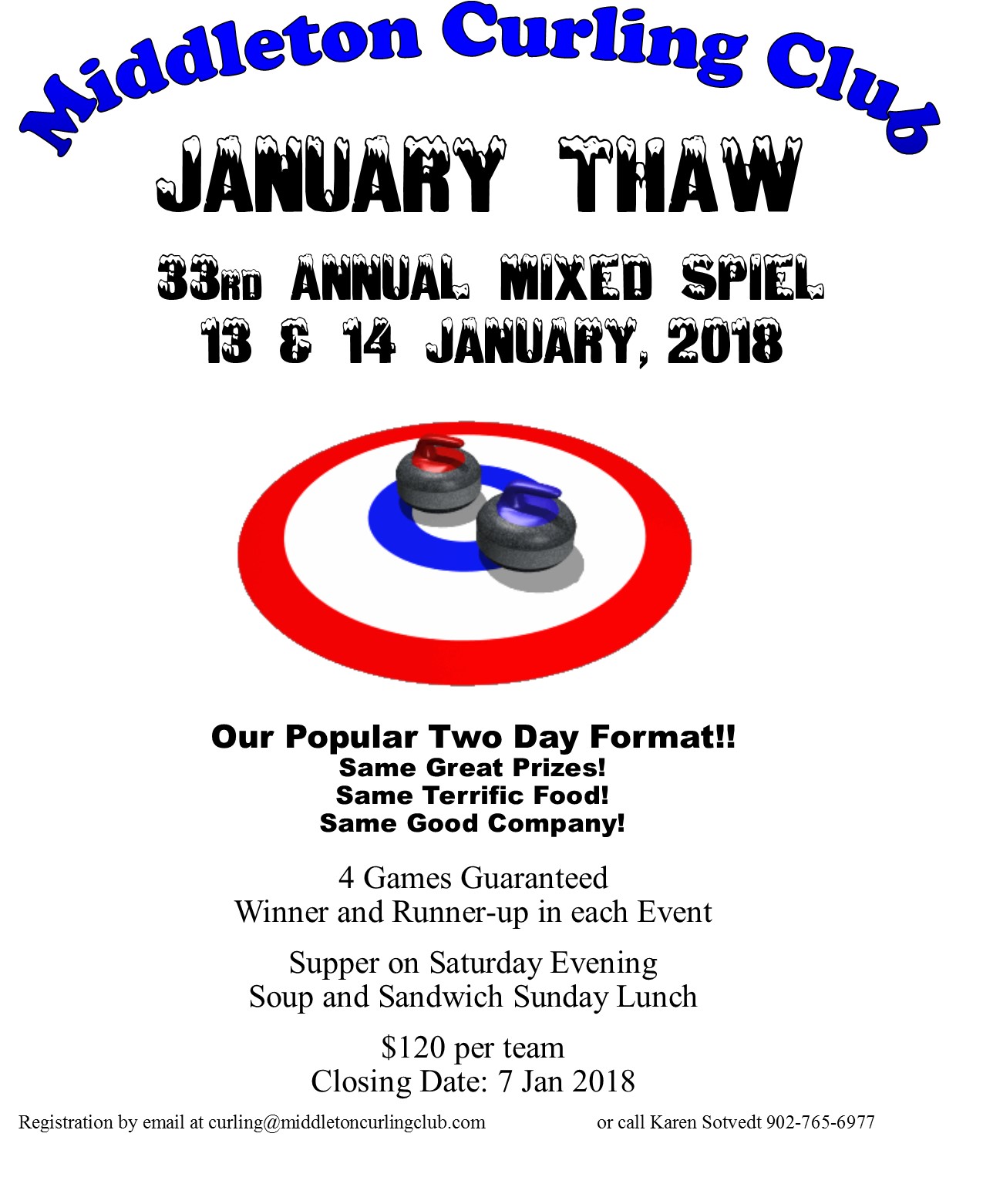 Two-day bonspiel for mixed teams. Four games guaranteed: three 6-end games on Saturday, eight-end games on Sunday.